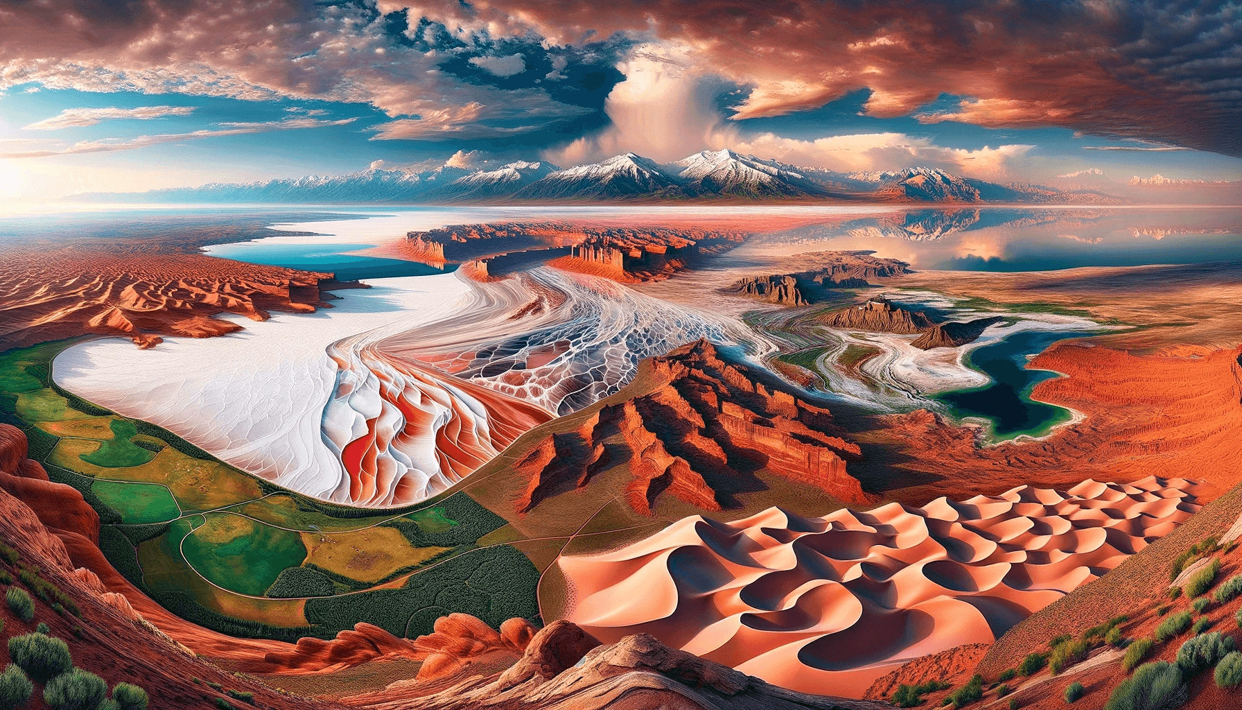 Our adventure begins on the mesmerizing Bonneville Salt Flats, located in northwestern Utah. These vast, seemingly endless salt pans are a remnant of the ancient Lake Bonneville. The salt flats cover approximately 46 square miles, creating a surreal, blindingly white landscape that seems to stretch infinitely. The salt crust here is so flat that it has been used for high-speed racing, including land speed record attempts. The flats reflect the sky like a giant mirror, making it a photographer’s paradise, especially during sunrise and sunset.